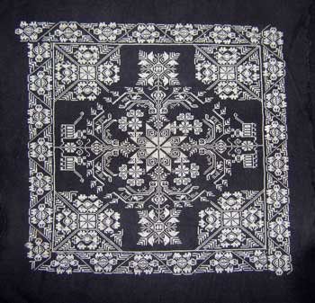 This cross-stitch is worked on black commercial fabric with white thread. The piece has an amazing 10 stitches per centimeter, the finest I have seen. 36 cm square |