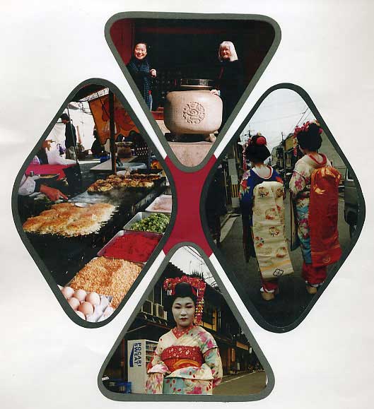 On our way to the Kiyomizu temple, we passed young girls training as Maiko, or apprentice Geisha, dressed in flamboyant textiles, hair styles and makeup. Note how these obi are tied in the back, in a long flowing style. |