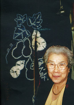 Mrs Hayashi stands in front of the Indigo dyed curtain called Noren. |