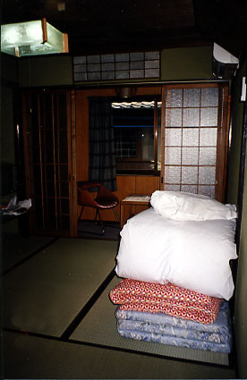 Japanese Inn In Kyoto I stayed at the Matsubaya Ryokan, run by Mrs Kimiko Hayashi. The elderly Mrs Hayashi has run the ryokan since her husband died eight years ago. Although she speaks no English, she communicates well and keeps her cliental in line with house rules. The rooms are typical Japanese style with futons, folded up during the day and tatamai rooms or sitting alcoves. Japanese green tea is brewed and placed in the room to refresh guests at the end of busy tourist days.